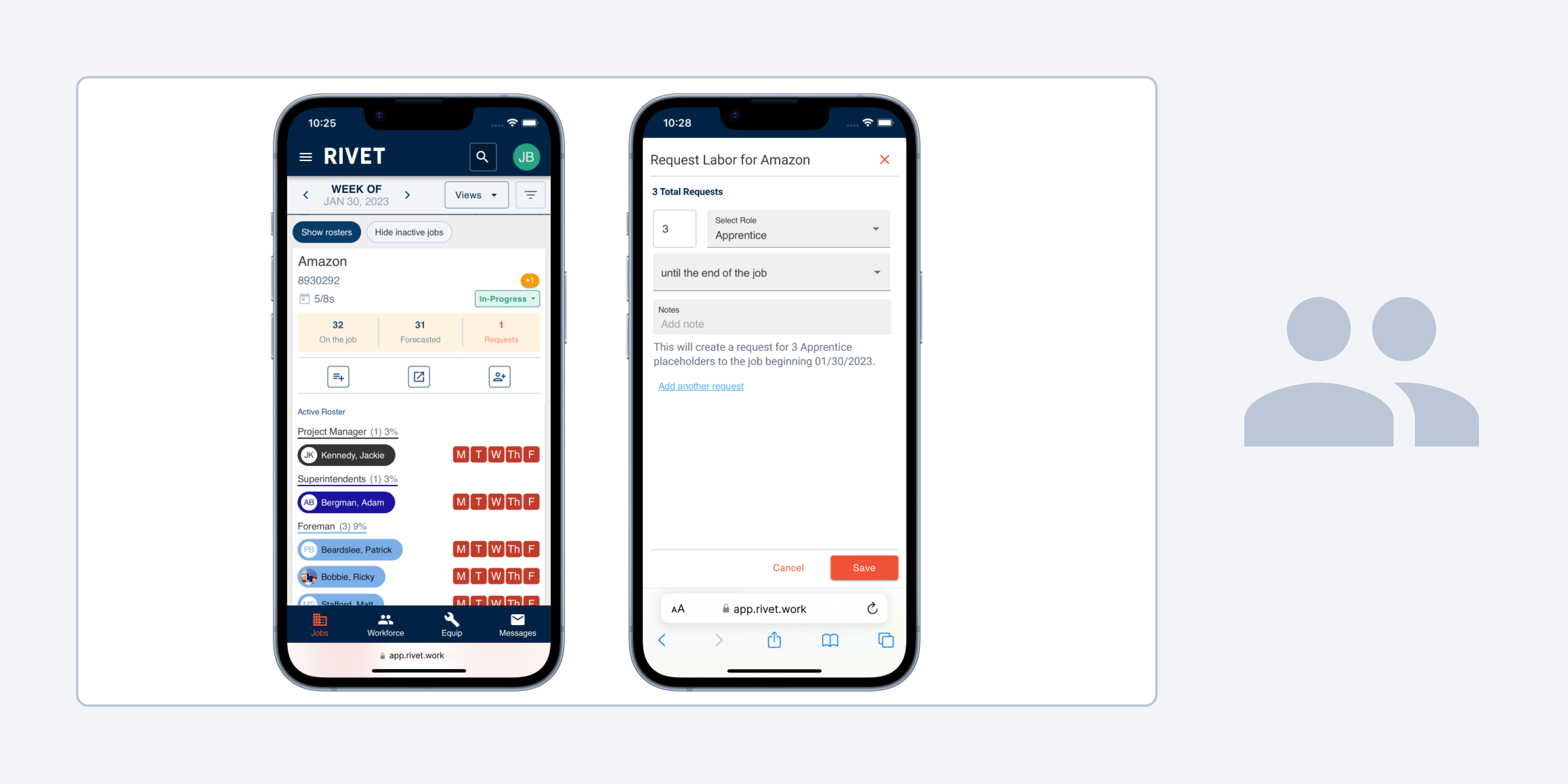 Conveniently review Job Rosters and Labor Requests entirely from the Jobs tab in your mobile view: