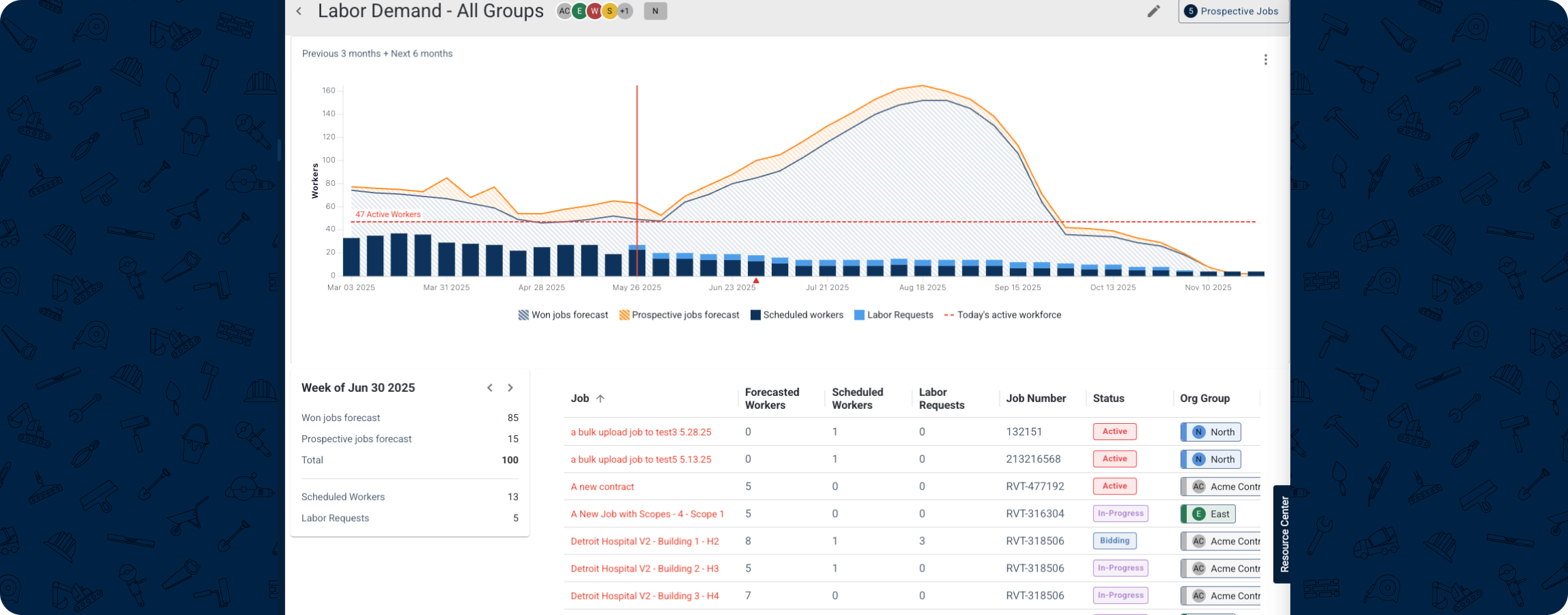 - Group managers allocating labor across jobsites