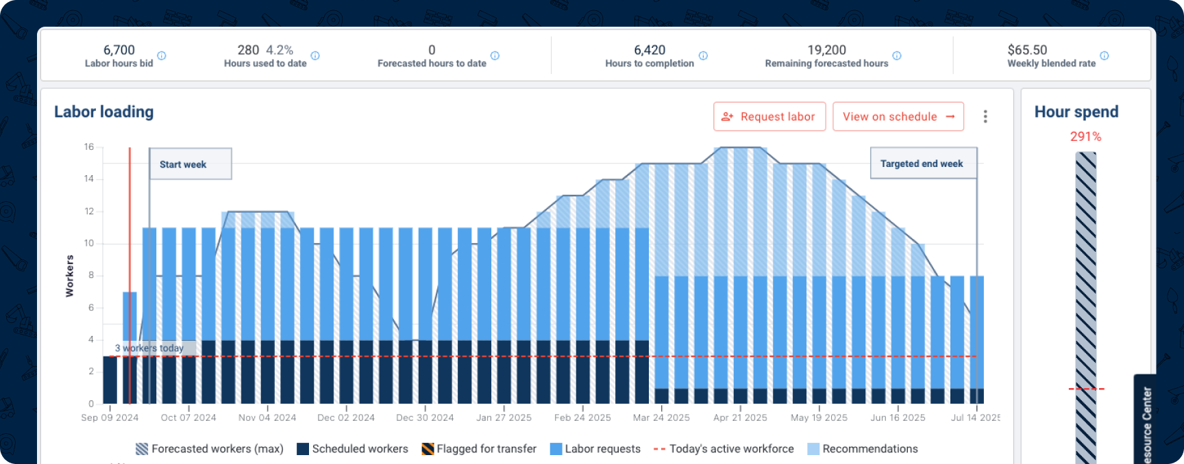 The latest Labor Forecasting update is here: Schedule To Your Forecast. With it, the RIVET platform will now automatically recommend the right amount of field employees and which roles to fill out your job's Labor Forecast as projects ramp up. See it in action below.