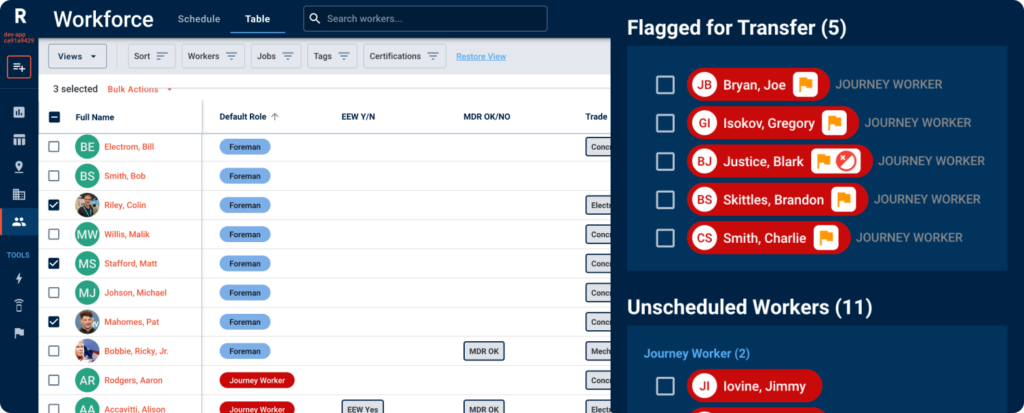 Second, your book of workers is as critical as your book of business. To stay competitive, you need a workforce management system where you can access profiles instantly. For example, you get immediate access to the right certifications, safety trainings, availability and locations of your workforce. Next, you systematically shuffle and reassign hundreds of workers across various states, union locals or job sites. Then, you can push automated messages for all of those changes. At RIVET, we’ve built features for transferring and dispatch that look and feel like your existing workflows, only better and easier to execute.